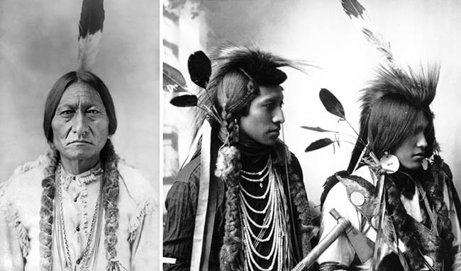Native Americans were divided in their hairstyles - those on the East Coast sporting entirely shaved heads save for a ridge of hair along the crown, whilst Plains Indians, both men and women, wore the recognized long braids adorned with feathers.