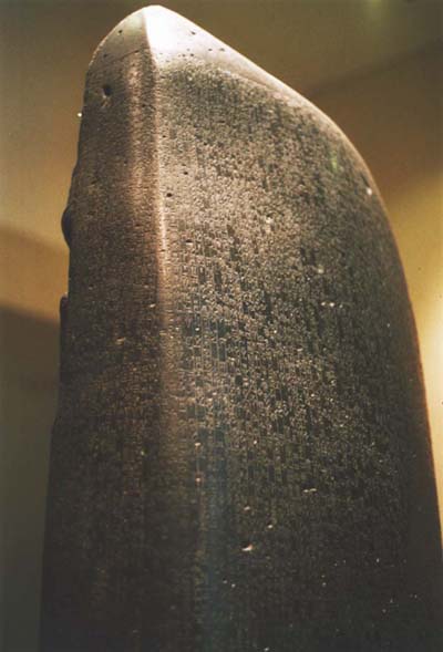 One nearly complete example of the Code survives today, on a diorite stele in the shape of a huge index finger, 2.25 m or 7.4 ft tall (see images at right). The Code is inscribed in the Akkadian language, using cuneiform script carved into the stele. It is currently on display in The Louvre, with exact replicas in the Oriental Institute in the University of Chicago, the library of the Theological University of the Reformed Churches (Dutch: Theologische Universiteit Kampen voor de Gereformeerde Kerken) in The Netherlands and the Pergamon Museum of Berlin.