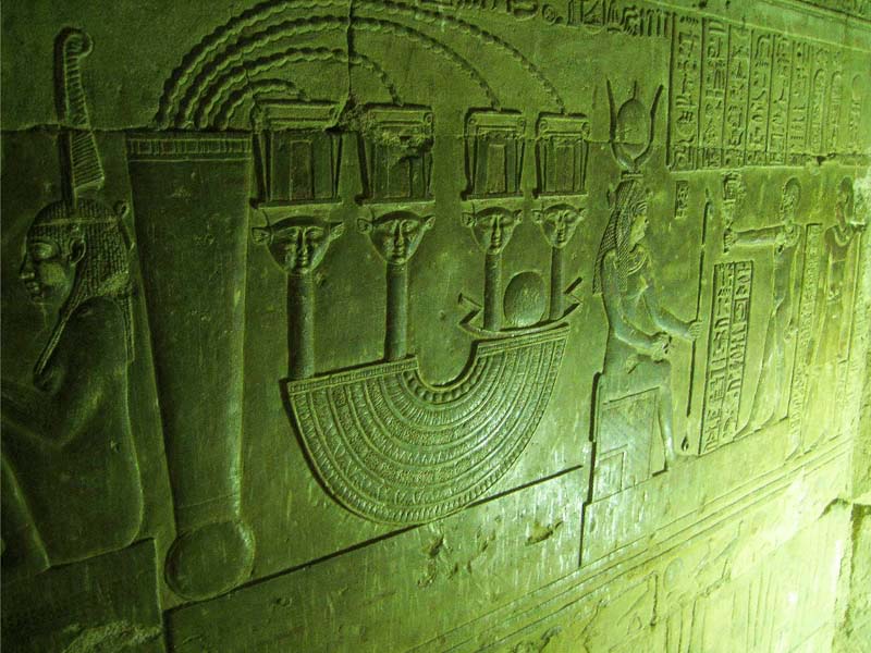 The depiction of Hathor's sacred menat necklace details the heavy semi-circular pectoral that hung from four sistra pendants. Chains attached to these pendants linked the necklace with its counterweight that hung down the back of the wearer. The necklace on the wall probably reproduces the actual necklace worn during the temple's holy rites and one of the most important objects stored underground.