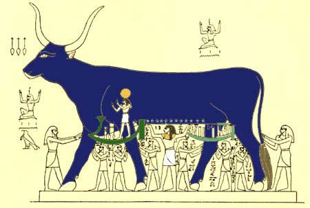 Since she was the more earthly cow-goddess, Milk was said to be the beer of Hesat, a rather meaningless phrase as Hesat means milk anyway. As a dairy cow, Hesat was seen as the wet-nurse of the other gods, the one who creates all nourishment. Thus she was pictured as a divine white cow, carrying a tray of food on her horns, with milk flowing from her udders.