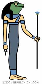 Heqet was usually depicted as a frog, or a woman with a frog's head, or more rarely as a frog on the end of a phallus to explicitly indicate her association with fertility. She was often referred to as the wife of Khnum.