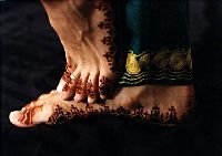 Women in India are traditionally painted henna on their hands and feet, insides of their arms and up their shins most often for a wedding, or other special occasion. Sometimes the chest, neck and throat will be tattooed. The subject matter is rather abstract, and often incorporates religious and auspicious symbols.
