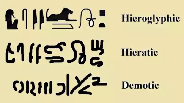 The Greeks distinguished this script from two other forms of Egyptian writing that were written with ink on papyrus or on other smooth surfaces. These were known as the hieratic, which was still employed during the time of the ancient Greeks for religious texts, and the demotic, the cursive script used for ordinary documents.
