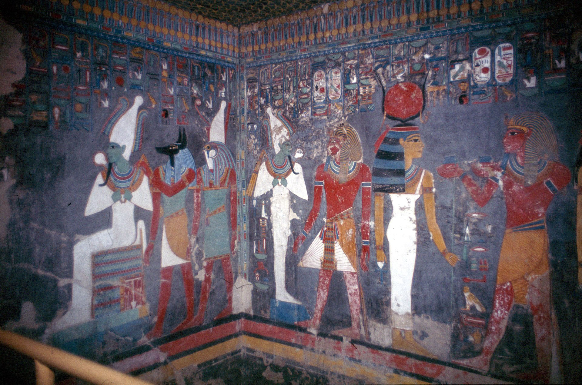 Military scenes were carved on the original peristyle court and scenes showing Horemheb's duties in office on the walls of the later, first peristyle open court including one where he deputised for Tutankhamun on the north wall. On the North wall are scenes from the funeral, showing kiosks with smash pots and mourners. Only the lowest register is well preserved. From the next register above only the legs of horses and the wheels of chariots are visible. On the east wall, on the north side are shown houses. The wall is in general only badly preserved.