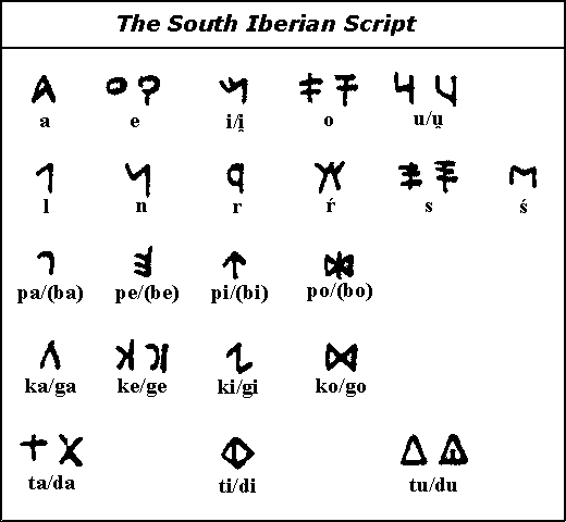 The Iberian family of scripts is consisted of two "styles", called Northeast and South. Structurally they are more or less the same, and the major difference between them is (a) geographical location, and (b) shape of the characters. Both Iberian scripts contain monophonemic (that is, only one sound, sort of like alphabetic) signs as well as syllabic ones. Iberian Alphabet
