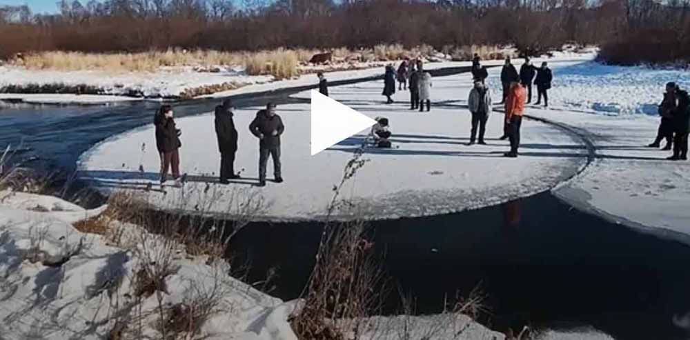 A drone video, shot in Shenyang City of northeast China's Liaoning Province shows several tourists standing on a huge ice disc rotating clockwise in a frozen river.
