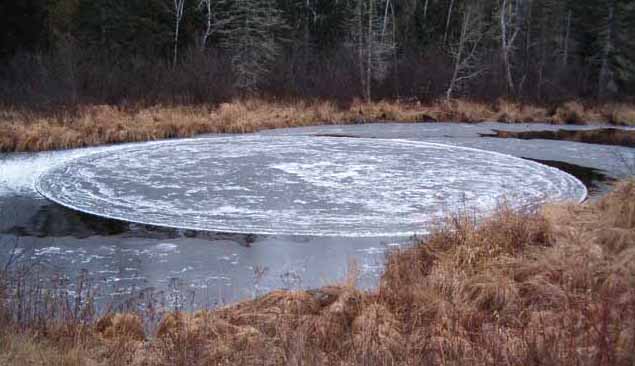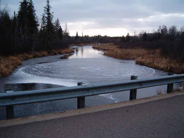 An ice circle has recently appeared on the Hemlock River located near Amasa, Michigan. December 26, 2006, a man was coming home from work at 12:45 AM and noticed pulsating lights as he turned off US 141 onto Townline Road which crosses the Hemlock River. As he approached the hill which breaks into the river basin, the lights disappeared. Thinking he was just going crazy he went home and went to bed. The next morning he drove down to the bridge and found a perfect circle about 50' in diameter cut into the ice that was rotating clockwise. Due to the man witnessing vibrating beam of lights around the area where the ice circle was discovered, researchers are looking for a possible connection between the two. We must also realize that ice circles can be made by natural currents in a stream or river.
