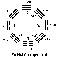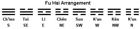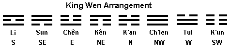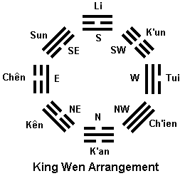 Each inquiry to the oracle will result in a hexagram reading and possibly additional line readings. A hexagram is made up of two trigrams. There are eight possible trigrams: Ch'ien (Cosmos), Chen (Thunder), K'an (Water), Ken (Mountain), K'un (Earth), Sun (Wind/Wood), Li (Fire), and Tui (Lake). Each trigram is made up of three lines. Each line is either broken or solid, corresponding to the complementary forces Yin (negative) and Yang (positive). Every time a coin is thrown, one line of the hexagram is determined, thus, six throws decide a hexagram.