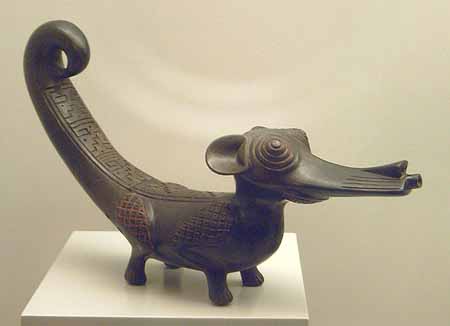 Incan ceramics are usually very distinct and easy to recognize. The shapes of the vessels are highly standardized. The most typical Incan pottery would have a spherical body with a cone shaped base. This spherical body usually includes two vertical side handles with a tall neck and flaring rim. The Incans often would place animal heads on their pottery as well usually near the top of the vessel. There were also several other popular styles for Incan ceramics which included a shallow dish with a single bird head and handle, a pedestal beaker, and a single or double handled bottle.