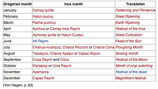 The Inca calendar had 12 months of 30 days, with each month having its own festival, and a five day feast at the end, before the new year began. The Incan year started in December, and began with Capac Raymi, the magnificent festival.