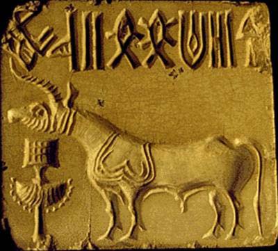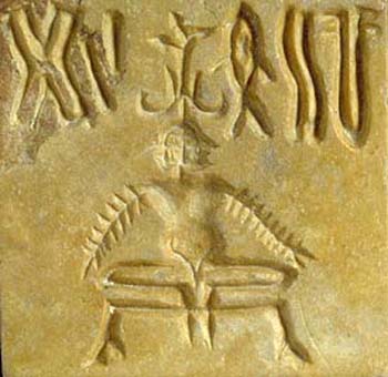This Indus seal depicts a nude male deity with three faces (tri-murti, Brahama god), seated in lotus position on a throne, perhaps wearing bangles on both arms and an elaborate headdress. Five symbols of the Indus script appear on either side of the headdress which is made of two outward projecting buffalo style curved horns, with two upward projecting points.
