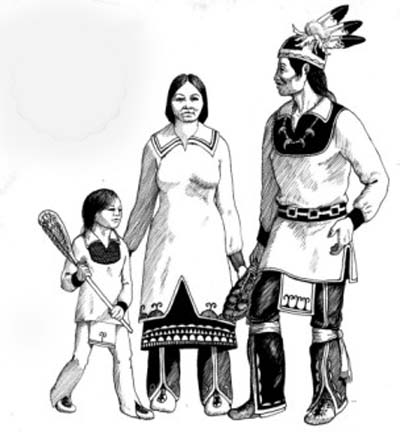 Iroquois men wore breechcloths with long leggings. Iroquois women wore wraparound skirts with shorter leggings. Men did not originally wear shirts in Iroquois culture, but women often wore a tunic called an overdress. Iroquois people also wore moccasins on their feet and heavy robes in winter. In colonial times, the Iroquois adapted European costume like long cloth shirts, decorating them with fancy beadwork and ribbon applique. Here is a webpage about traditional Iroquois dress, and here are some photographs and links about American Indian clothes in general.