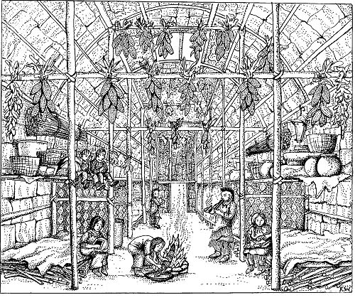 The Iroquois people lived in villages of longhouses, which were large wood-frame buildings covered with sheets of elm bark. Iroquois longhouses were up to a hundred feet long, and each one housed an entire clan (as many as 60 people.) Here are some pictures of Indian longhouses like the ones Iroquois Indians used, and a drawing of what a longhouse looked like on the inside. Today, Iroquois families live in modern houses and apartment buildings, just like you.