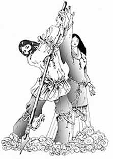 The latter performed the ceremony of divining and said to them: "It is the woman's fault. In turning round the Pillar, it was not right and proper that the female Deity should in speaking have taken precedence of the male. That is the reason." The two Deities saw the truth of this divine suggestion, and made up their minds to rectify the error. So, returning to the earth again, they went once more around the Heavenly Pillar.