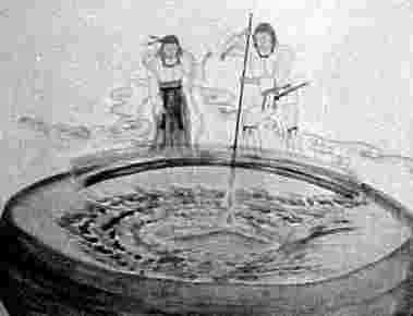 They were, at first, perplexed just how and where to start, but at length Izanagi suggested to his companion that they should try the effect of stirring up the brine with their spear. So saying he pushed down the jeweled shaft and found that it touched something. Then drawing it up, he examined it and observed that the great drops which fell from it almost immediately coagulated into an island, which is, to this day, the Island of Onokoro.