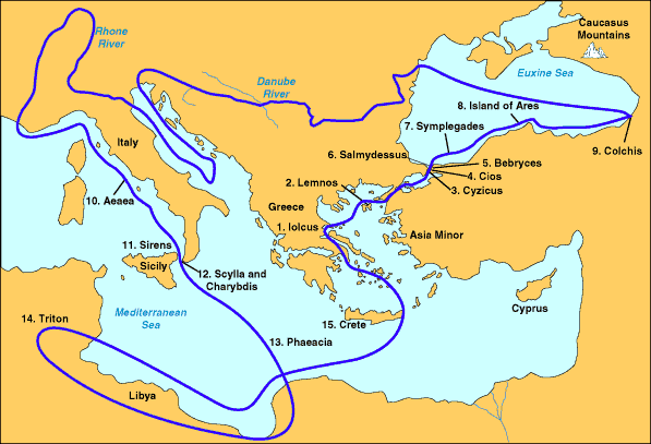 The Argo, with her crew of heroes, left Thessaly and having touched at the Island of Lemnos, thence crossed to Mysia and thence to Thrace . Here they found the sage Phineus, and from him received instruction as to their future course. It seems the entrance of the Euxine Sea was impeded by two small rocky islands, which floated on the surface, and in their tossings and heavings occasionally came together, crushing and grinding to atoms any object that might be caught between them. They were called the Symplegades, or Clashing Islands.