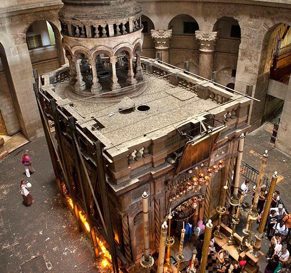 During repair work, archaeologists removed the marble slabs that covered the walls of the limestone cave where Jesus was purportedly laid after crucifixion. Around 132 A.D., the Roman Emperor Hadrian began constructing the city of Aelia Capitolina on the ruins of Jerusalem, which had been decimated by Roman forces in 70 A.D. As Aelia Capitolina took shape, the construction of a temple to Venus destroyed the sites Christian tradition says Jesus was crucified and the tomb in which he was reportedly covered. But some 200 years later, after Christianity began to take root throughout Roman empire, the first Christian emperor Constantine ordered the temple be removed in order to reveal JesusŐ tomb. Constantine then had a church built around the site, which became known in later centuries as the Basilica of the Holy Sepulchre