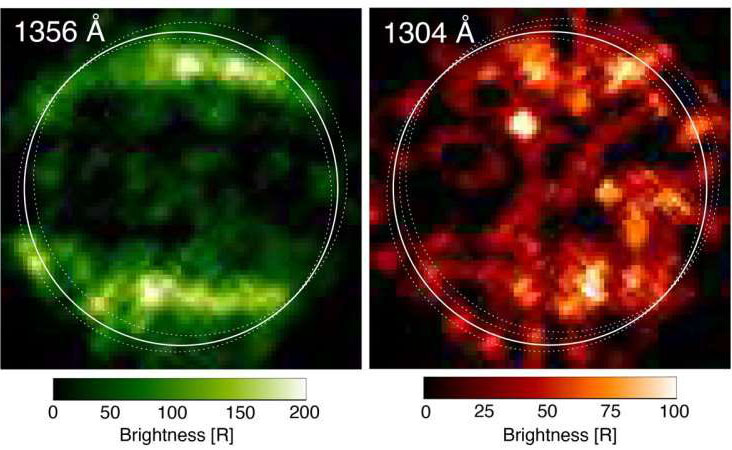 Aurora on Jupiter. Three bright dots are created by magnetic flux tubes that connect to the Jovian moons Io (on the left), Ganymede and Europa on the bottom. In addition, the very bright almost circular region, called the main oval, and the fainter polar aurora can be seen.
