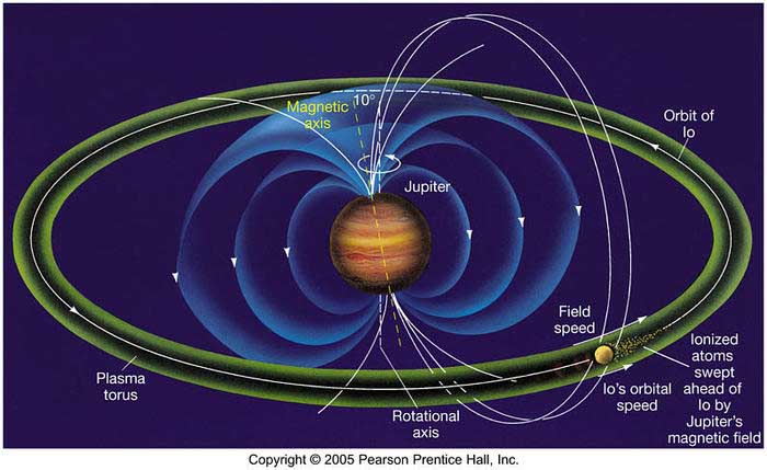Jupiter has a very large and powerful magnetosphere. In fact, if you could see Jupiter's magnetic field from Earth, it would appear five times as large as the full moon in the sky despite being so much farther away. This magnetic field collects a large flux of particle radiation in Jupiter's radiation belts, as well as producing a dramatic gas torus and flux tube associated with Io. Jupiter's magnetosphere is the largest planetary structure in the solar system.