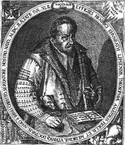 Heinrich Khunrath or Dr Henricus Khunrath as he was also called, was a famous physician, Hermetic philosopher, and alchemist. His most famous work is the Amphitheatrum Sapientiae Aeternae (Amphitheater of Eternal Wisdom), a work on the mystical aspects of alchemy, which contains the oft-seen engraving entitled "The First Stage of the Great Work," better-known as the "Alchemist's Laboratory." Amphitheatrum Sapientiae Aeternae was first published at Hamburg in 1595, but then made more widely available in an expanded edition published in Hanau in 1609. Frances Yates considered him to be a link between the philosophy of John Dee and Rosicrucianism.