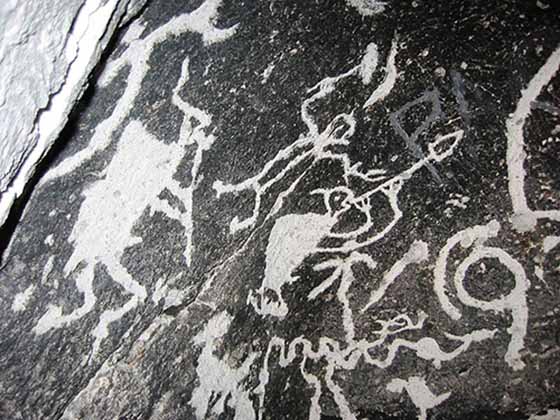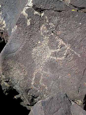 Kokopelli is one of the most easily recognized figures found in the petroglyphs and pictographs of the Southwest. The earliest known petroglyph of the figure dates to about 1000 AD.[4] The Spanish missionaries in the area convinced the Hopi craftsmen to usually omit the phallus from their representations of the figure. As with most kachinas, the Hopi Kokopelli was often represented by a human dancer. Kokopelli is a cottonwood sculpture often carved today.