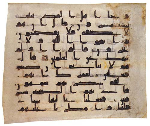 In calligraphy, earliest extant Islamic style of handwritten alphabet that was used by early Muslims to record the Qur'an. This angular, slow-moving, dignified script was also used on tombstones and coins as well as for inscriptions on buildings. Some experts distinguish Kufi proper from Meccan and Medinese scripts, which were also used to copy the Qur'an.