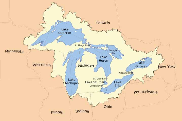 The Great Lakes (sometimes, Laurentian Great Lakes) are a collection of freshwater lakes located in northeastern North America, on the CanadaĐUnited States border, which connect to the Atlantic Ocean through the Saint Lawrence Seaway and the Great Lakes Waterway. Consisting of Lakes Superior, Michigan, Huron, Erie, and Ontario, they form the largest group of freshwater lakes on Earth, containing 21% of the world's surface fresh water.