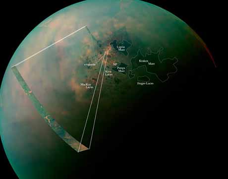 NASA's Cassini space probe is getting an exceptional look at the vast liquid lakes of Titan's north pole, where dense winter clouds are finally retreating thanks to a change in seasons on Saturn's largest moon. A clearer view of Titan's wet northern region could provide clues about the moon's hydrologic cycle and the evolution of its seas. New images released by NASA this week even revealed the Titan equivalent of salt flats surrounding its northern lakes, some of which are as big as the Caspian Sea and Lake Superior combined. Titan more closely resembles Earth than any other planet or moon in our solar system, with a dense atmosphere and stable liquids on its surface. But Titan's clouds, lakes and rain are made up of hydrocarbons, such as ethane and methane, rather than water.