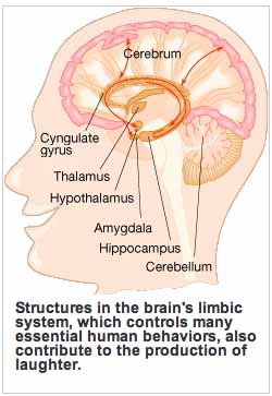 Principal fissures and lobes of the cerebrum viewed laterally. Modern neurophysiology states that laughter is linked with the activation of the ventromedial prefrontal cortex, which produces endorphins after a rewarding activity: after you have a good meal, after you have sexual intercourse and after you understand a joke. Research has shown that parts of the limbic system are involved in laughter. The limbic system is a primitive part of the brain that is involved in emotions and helps us with basic functions necessary for survival. Two structures in the limbic system are involved in producing laughter: the amygdala and the hippocampus.