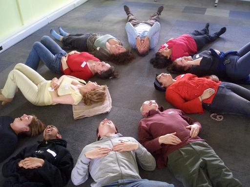 In the second stage, the person starts with a gradual smile, and then slowly begins to purposely belly laugh or cry, whichever occurs. In the final stage, the person abruptly stops laughing or crying, then with their eyes now closed they breathe without a sound and focus their concentration on the moment. The process is approximately a 15 minute exercise. This may be awkward for some people as the laughter is not necessarily spontaneous. This is generally practiced on an individual basis.