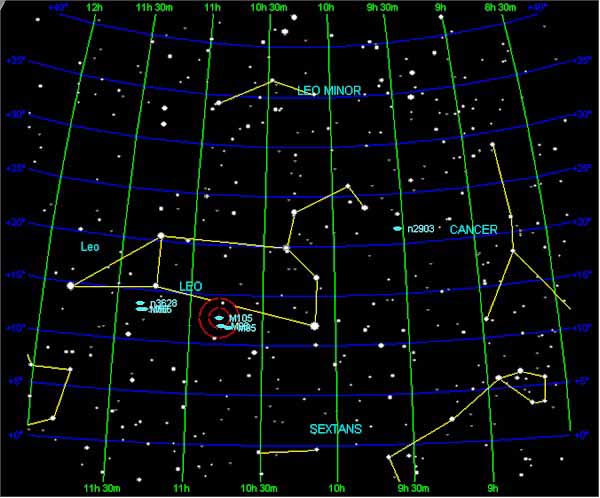 To locate Leo use the constellation of Ursa Major, commonly known as the Plough in the British Isles or the Great Bear in North America. The Plough is a prominent constellation in the northern hemisphere, its seven bright stars never set from mid latitudes and most people are familiar with its shape, making it a handy signpost to other constellations. Follow a line from the two end stars of the Plough, known as the 'Pointers' (used to find Polaris, the pole star) away from the celestial north pole and you will arrive in the middle of Leo.