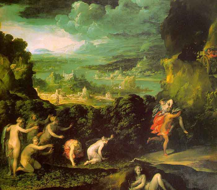 In Greek mythology, the stars of Libra came to represent the Golden Chariot of Pluto pulled by four jet-black horses. One day while visiting the Upperworld in his chariot, Pluto saw Persephone, the daughter of Zeus harvest-goddess Demeter. The story of Pluto's abduction of Persephone is a widely known Greek myth. When he took Persephone back to Tartarus, the deepest part of Hades, the Upperworld changed. The myth of her abduction represents her function as the personification of vegetation which shoots forth in spring and withdraws into the earth after harvest; hence she is also associated with spring and with the seeds of the fruits of the fields.
