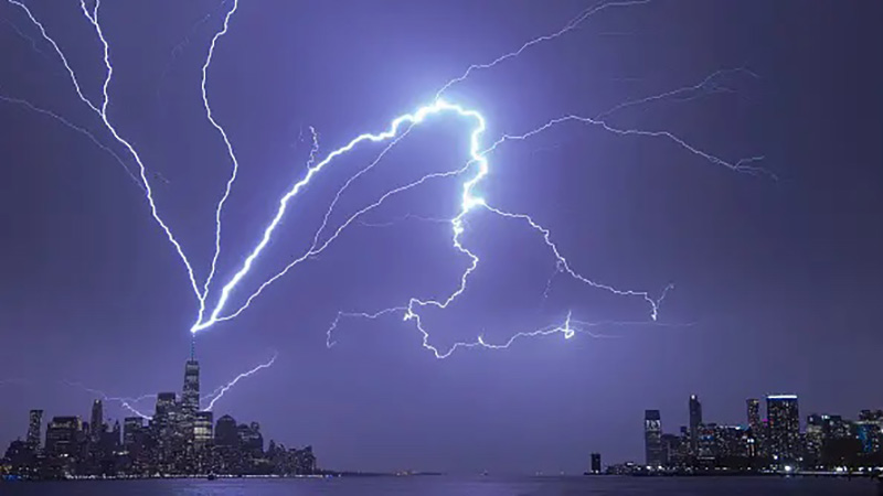 Dramatic lightning bolts struck the Freedom Tower in New York City.
