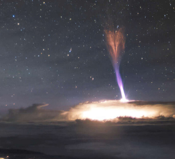 Sprites and jets are fleeting atmospheric phenomena, hard enough to witness, let alone photograph. But a new image from an observatory in Hawaii captures both a red sprite and a blue jet in the same shot. The photo, released on Feb. 24, comes courtesy a "cloud cam" at the Gemini North telescope, part of the International Gemini Observatory located on Maunakea. Sprites and jets are upper-atmospheric phenomena caused by electrical discharges. Sprites, which are typically reddish-orange and sometimes blue-green, occur in the mesosphere, between 30 and 50 miles (50 and 80 kilometers) in altitude. They're often triggered by regular, lower-altitude lightning, but are much cooler in temperature. They're also sometimes shaped like jellyfish. Blue jets also occur at high altitude, triggered by a discharge of electricity from the positively-charged upper portion of a storm cloud to the negatively-charged cloud top, according to a paper published Jan. 20 in the journal Nature. They typically appear as blue streamers shooting spaceward.