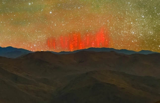 The photo was captured from ESO's Paranal Observatory. A few days earlier during the early morning hours of Jan. 20 Petr captured another series of sprites from the La Silla site, generated by a storm over Argentina over 310 miles (500 km) away. So-named because of their elusive nature, sprites appear as clusters of red tendrils above a lighting flash, often extending as high as 55 miles (90 km) into the atmosphere. The brightest region of a sprite is typically seen at altitudes of over 40-45 miles (65-75 km).