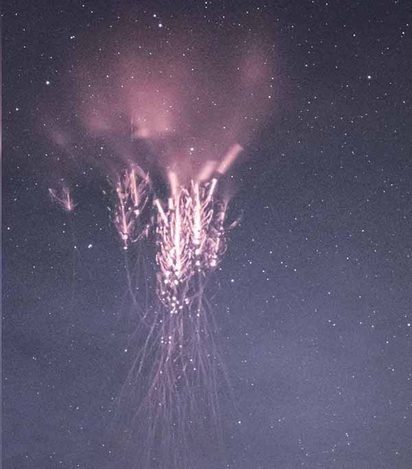 Red sprites are large-scale electrical discharges that occur high above thunderstorm clouds, usually triggered by the discharges of positive lightning between an underlying thundercloud and the ground. However, the red sprites appear high in Earth's atmosphere, sometimes 50-90 kilometers (31 to 55 miles) in altitude. People have been telling folktales for centuries about mysterious red lights in the sky, which were usually dismissed by experts.