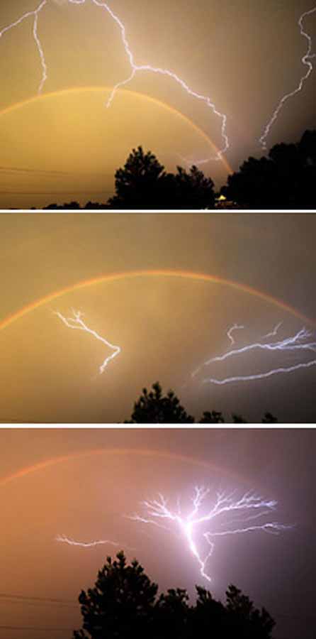 June 2006 -- When a rainbow formed in the sky people stopped and stared at the natural wonder. But then lightning sparked across the evening panorama as two of nature's most spectacular phenomenon created an unusual alliance. The clash of weather was seen above the affluent city of Fort Smith, in Arkansas. The intracloud lightning, known as an anvil crawler, is the most common form of lightning, with the electrical charge contained within a single cumulonimbus cloud.