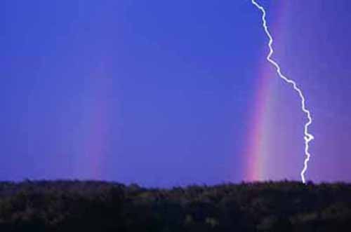 On June 28, 2006, Julie Juratic took the picture as a thunderstorm was winding down over the Cuyahoga Valley National Park in Ohio. A peaceful rainbow split is down the middle by a bolt of lightning. Although we seldom see them together, rainbows and lightning are related. Both are created by rain. Raindrops make rainbows by catching the rays of the sun and spreading them into their underlying colors. Raindrops make lightning by rubbing against ice crystals in thunderclouds. Like socks rubbing against carpet, raindrops rubbing against ice crystals create an electrical charge and -- zap-- lightning.