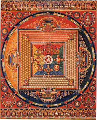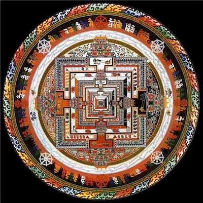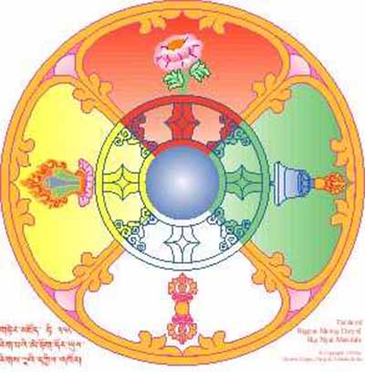The mandala is usually a symbolic representation which depicts the qualities of the enlightened mind in harmonious relationship with one another. A mandala may also be used to represent the path of spiritual development. On another level a mandala can be a symbolic representation of the universe, as in one of the four foundation practices of the Vajrayana, in which a mandala representing the universe is offered to the Buddha.