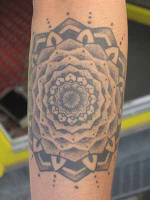 The basic form of most mandalas is a square with four gates containing a circle with a center point. Each gate is in the general shape of a T. Mandalas often exhibit radial balance.
