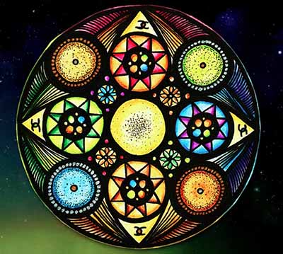 In practice, the term 'Mandala' has become a generic term for any plan, chart, or geometric pattern which represents the cosmos metaphysically or symbolically, a microcosm of the universe from the human perspective. A mandala, especially its center, can be used during meditation as an object for focusing attention. The symmetrical geometric shapes which mandalas tend to have, draw the attention of the eyes towards their center.