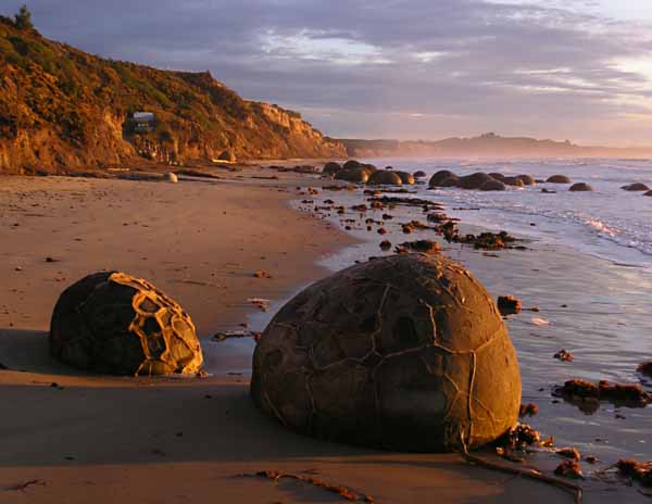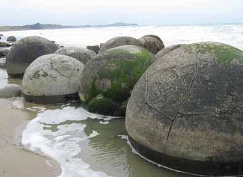 40 kilometers south of Oamaru, New Zealand, is a beach where hundreds of calcium carbonate spheres have fallen out of a cliff face and rolled down into the water. They range in size from small nodules to giant balls over 4 meters in diameter. Said to be the result of slow growth around a nucleus, the spheres are referred to as concretions and are thought to be the result of tiny amounts of mineral precipitation taking place over 65 million years.
