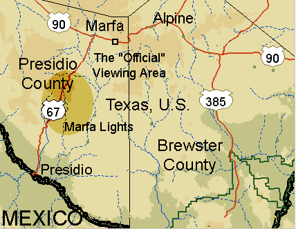 Less frequent accounts of seemingly similar anomalous nocturnal lights have arisen along a broad and elongated region within west Texas, stretching generally from El Paso southeastward along the Rio Grande valley, past Big Bend National Park and farther southeastward into Mexico.