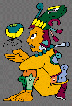 Kinich Ahau was the Sun god. He was the patron god of the city Itzamal. Supposedly, he visited the city at noon everday. He would descend as a macaw and consume prepared offerings. Kinich Ahau is usually shown with jaguar-like features (ex. filed teeth). Kinich Ahau also wears the symbol of Kin, a Mayan day. Kinich Ahau was also know by the name Ah Xoc Kin, who was associated with poetry and music.