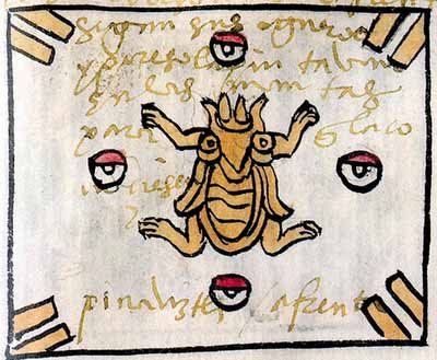 One of the non-Maya symbols frequently associated with Mayanism is Hunab Ku, a black-and-white design whose earliest documented appearance is in the Aztec Codex Magliabechiano, where it appears (in yellow and black) in the upper left hand corner of p. 5/2 of a facsimile of the Codex Magliabecchiano published by Zelia Nuttall as The Book of the Life of the Ancient Mexicans, Containing an Account of Their Rites and Superstitions, an Anonymous Hispano-Mexican Manuscript Preserved at the Biblioteca Nazionale Centrale, Florence, Italy in 1903.