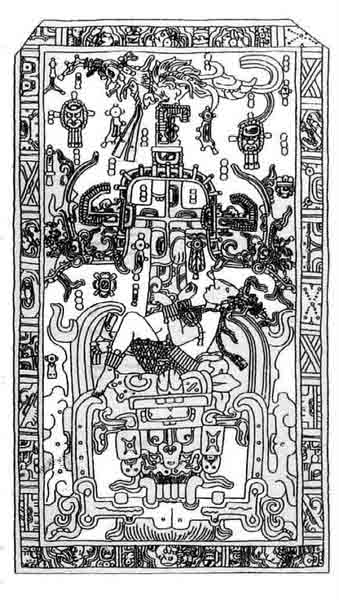 It is believed that Lord Pakal's sarcophagus lid, which was located at Palenque, is probably the single most comprehensive image which relates the Vision Serpent to Maya religion. It depicts the death of Pakal and his descent into the Underworld. The bicepalous serpent bar is placed horizontally on the World Tree and is the conduit for this transition. In the same way that the Vision Serpent represents a conduit between the physical world and the spirit realm of the ancestors, this bicephalous serpent bar represents a conduit between the realm of the living and the realm of the dead.
