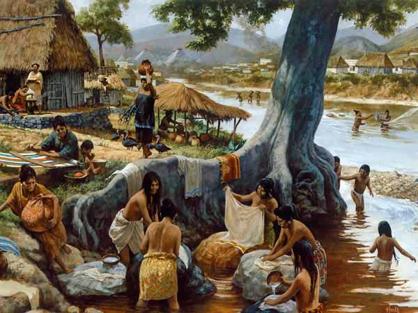 The ordinary garment of men was a cotton breechcloth wrapped around the middle, with sometimes a sleeveless shirt, either white or dyed in colors.