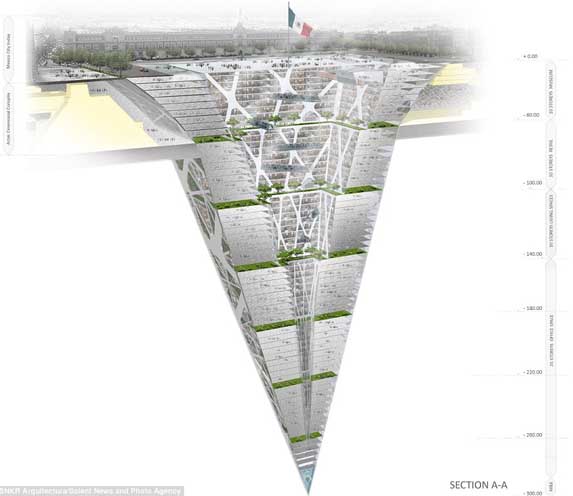 The stunning upside down pyramid in the middle of Mexico City is designed to get around height limits on new buildings in the capital. The subterranean building will have 10 stories each for homes, shops and a museum, as well as 35 stories for offices. The Earthscraper preserves the iconic presence of the city square and the existing hierarchy of the buildings that surround it. It is an inverted pyramid with a central void to allow all habitable spaces to enjoy natural lighting and ventilation. It will also allow the numerous activities that take place on the city square year round such as concerts, open-air exhibitions and military parades to go ahead.