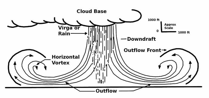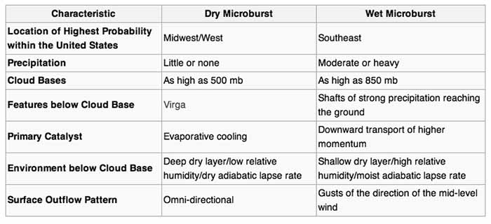 A microburst is a very localized column of sinking air, producing damaging divergent and straight-line winds at the surface that are similar to, but distinguishable from, tornadoes, which generally have convergent damage. There are two types of microbursts: wet microbursts and dry microbursts. They go through three stages in their life cycle: the downburst, outburst, and cushion stages. The scale and suddenness of a microburst makes it a great danger to aircraft due to the low-level wind shear caused by its gust front, with several fatal crashes having been attributed to the phenomenon over the past several decades.A microburst often has high winds that can knock over fully grown trees. They usually last for a duration of a couple of seconds to several minutes. Read more ...