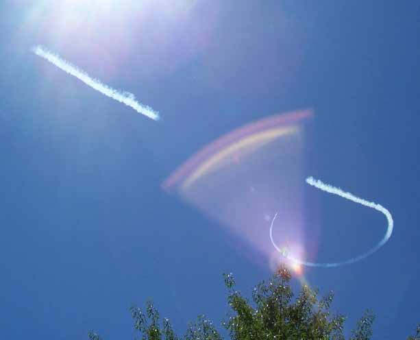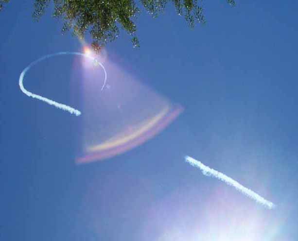 My friend Mike, took some interesting photos while pointing his digital camera towards the sun today. He thought that he had captured images of UFO's, but these 2 photos were created by sun refraction. The fun is in the 'eye of the beholder', or personal interpretation, which I have labeled Photo Scrying.